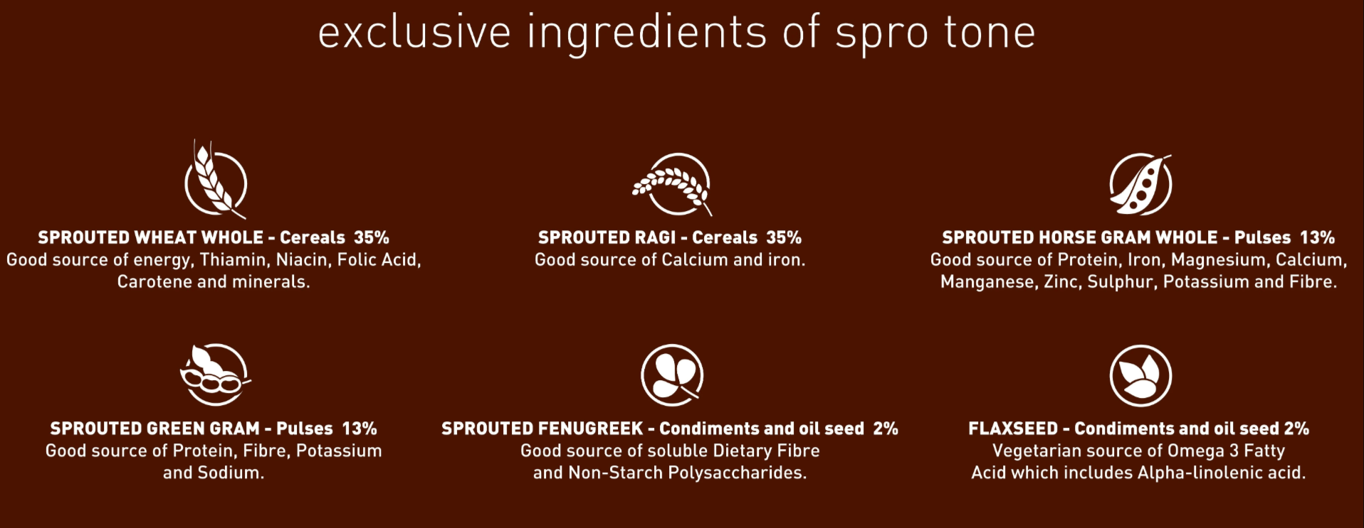 • Sprouted Ragi (Cereals – 35%) – Good source of Calcium and Iron.